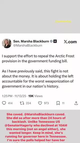 She caved. @MarshaBlackburn caved. She did so after more than 24 hours of backlash. Unlike Tennessee...