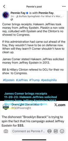Comer brings receipts: Hakeem Jeffries took money from Jeffrey Epstein. Plaskin a non vote rep, ...