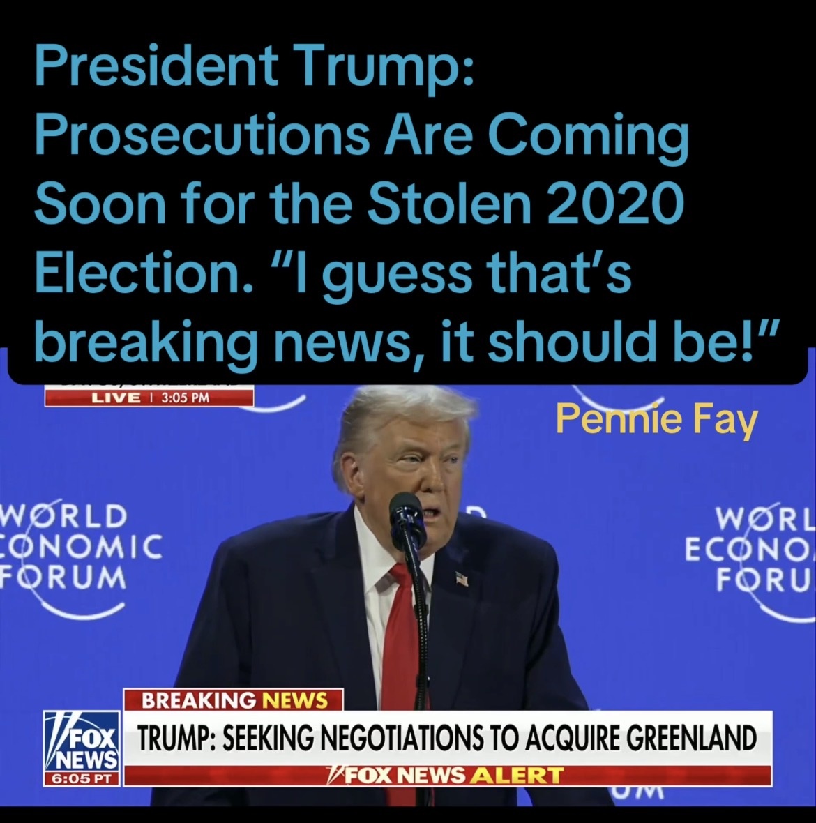 Donald J. Trump, your friends at @ticktock gave me a strike for posting your 2020 election theft speech in Davos today. They claim you’re fake news!