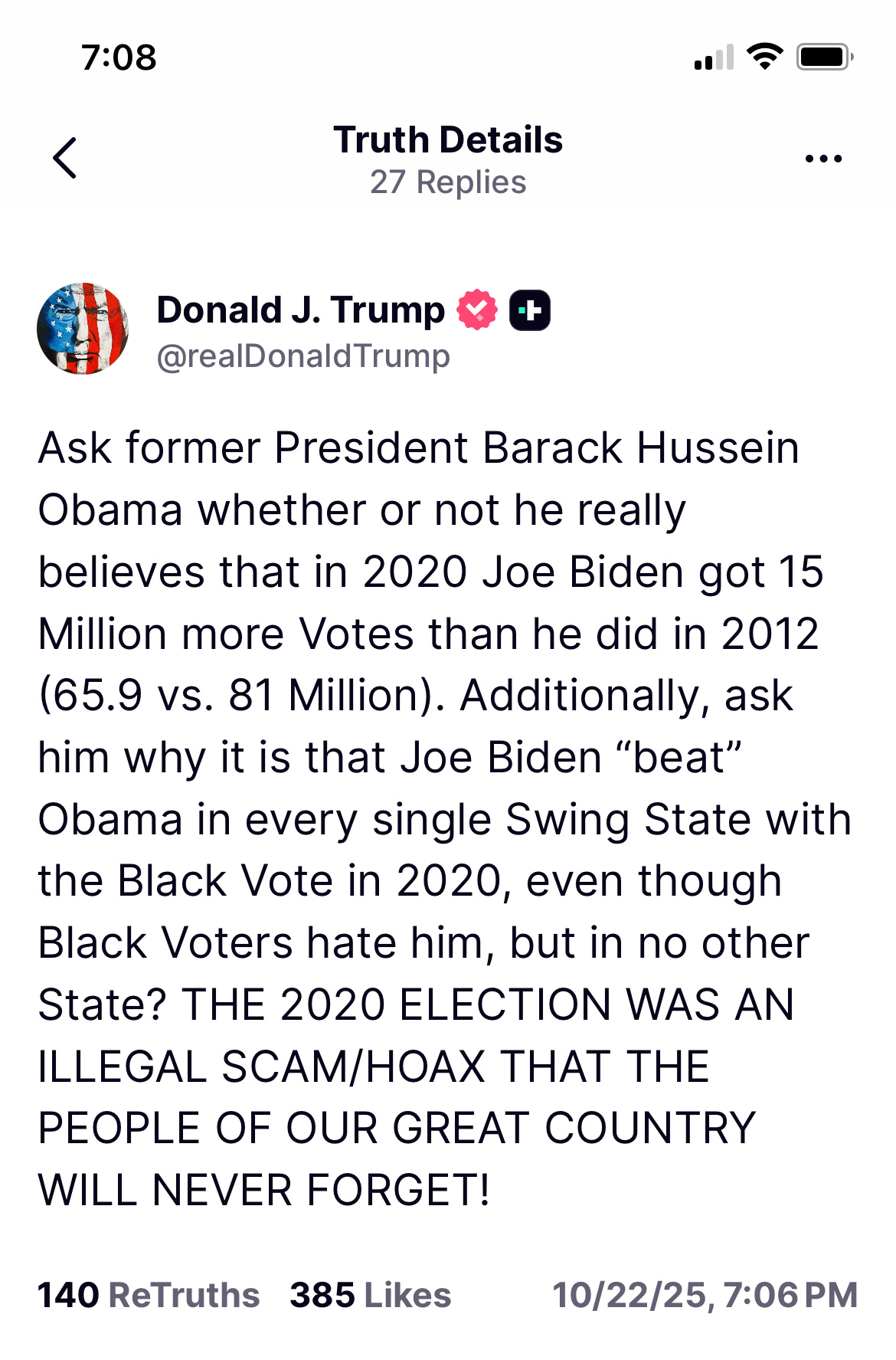 Ask former President Barack Hussein Obama whether or not he really believes that in 2020 Joe Biden got 15 Million more Votes than he did in 2012 (65.9 vs. 81 Million). Additionally, ask him why it is that Joe Biden “beat” Obama in every single Swing State with the Black Vote in 2020, even though Black Voters hate him, but in no other State? THE 2020 ELECTION WAS AN ILLEGAL SCAM/HOAX THAT THE PEOPLE OF OUR GREAT COUNTRY WILL NEVER FORGET!