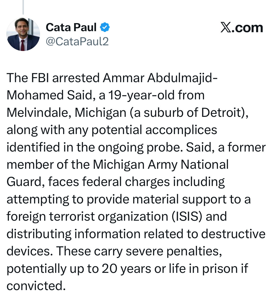 As per Cata Paul: The Plot: “The FBI arrested Ammar Abdulmajid-Mohamed Said, a 19-year-old from Melvindale, Michigan (a suburb of Detroit)”