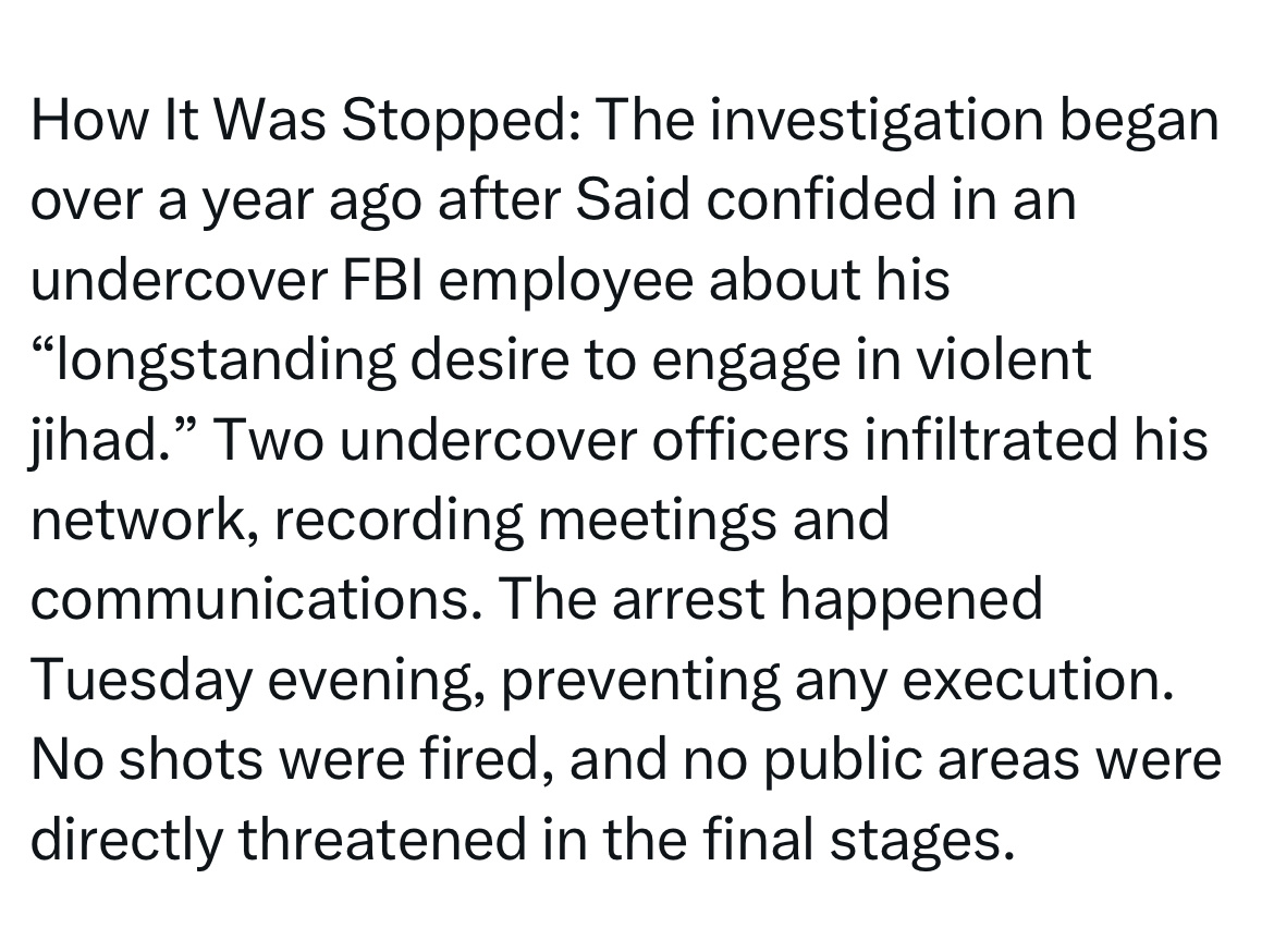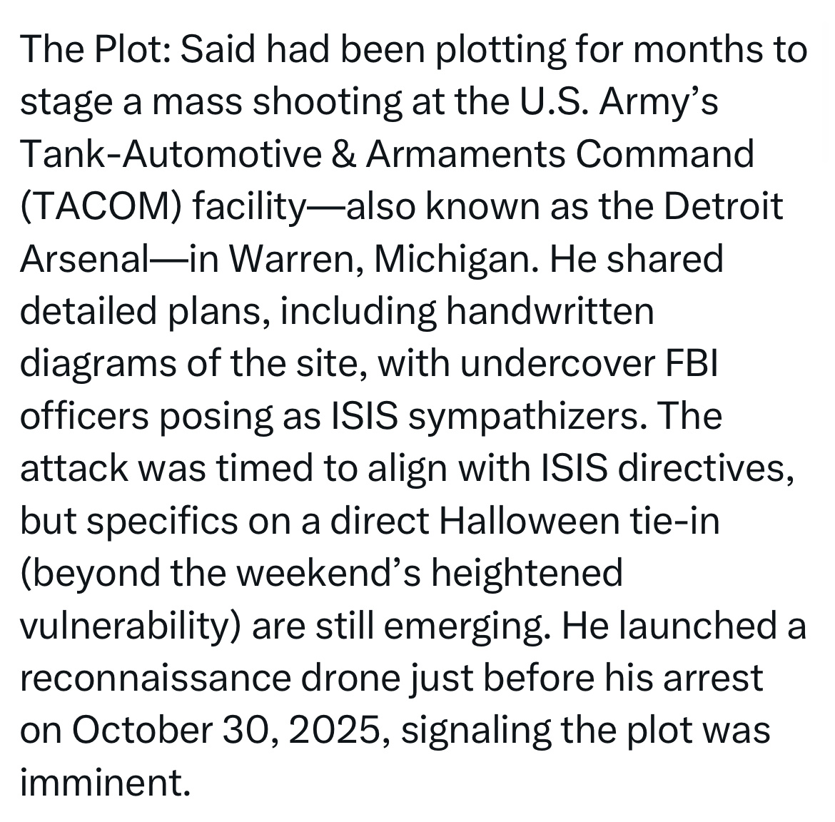 “Said had been plotting for months to stage a mass shooting at the U.S. Army’s Tank-Automotive & Armaments Command (TACOM) facility—also known as the Detroit Arsenal—in Warren, Michigan. He shared detailed plans, including handwritten diagrams of the site, with undercover FBI officers posing as ISIS sympathizers. The attack was timed to align with ISIS directives, but specifics on a direct Halloween tie-in (beyond the weekend’s heightened vulnerability) are still emerging. He launched a reconnaissance drone just before his arrest on October 30, 2025, signaling the plot was imminent.”