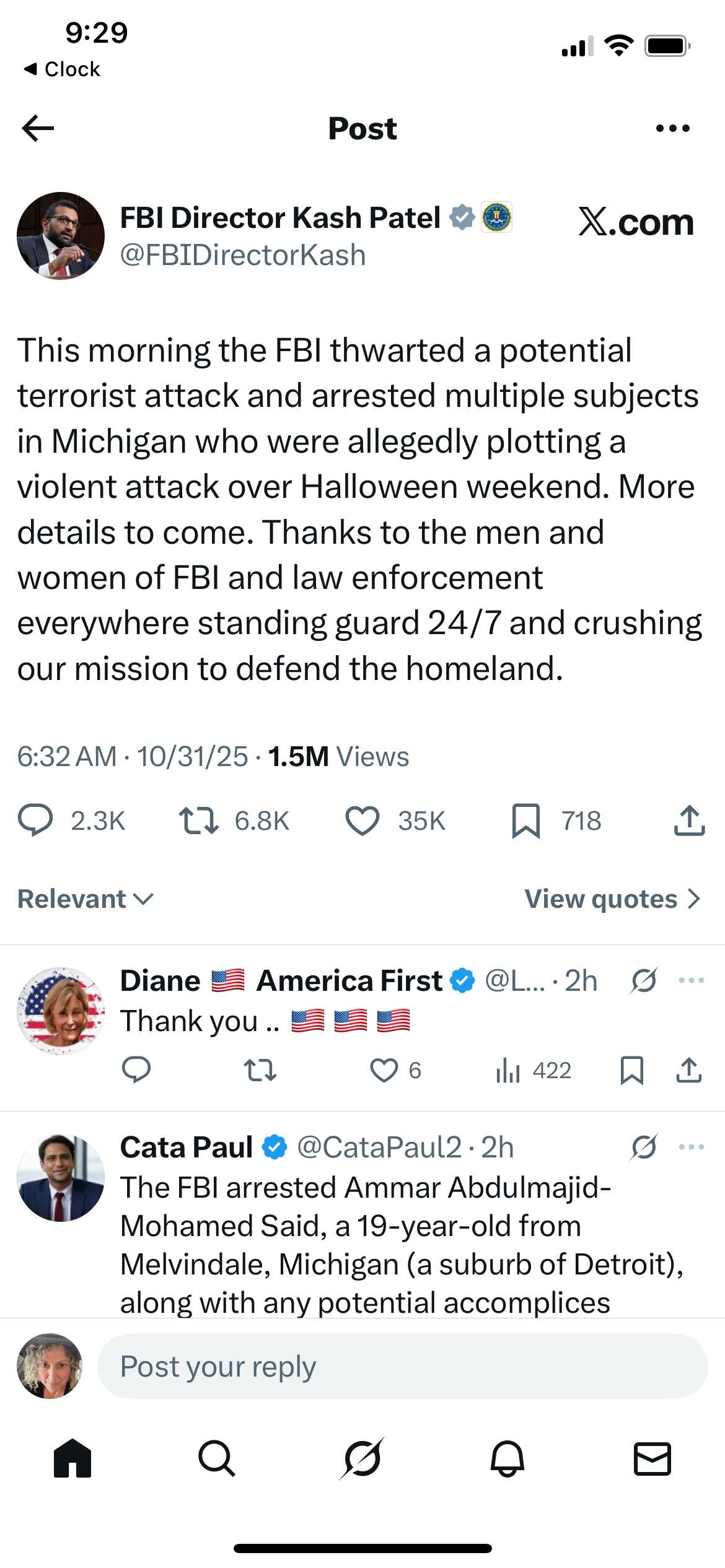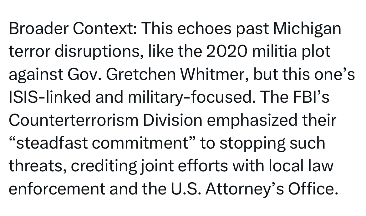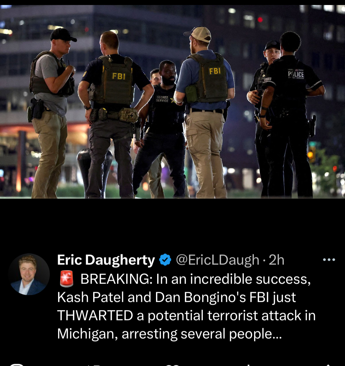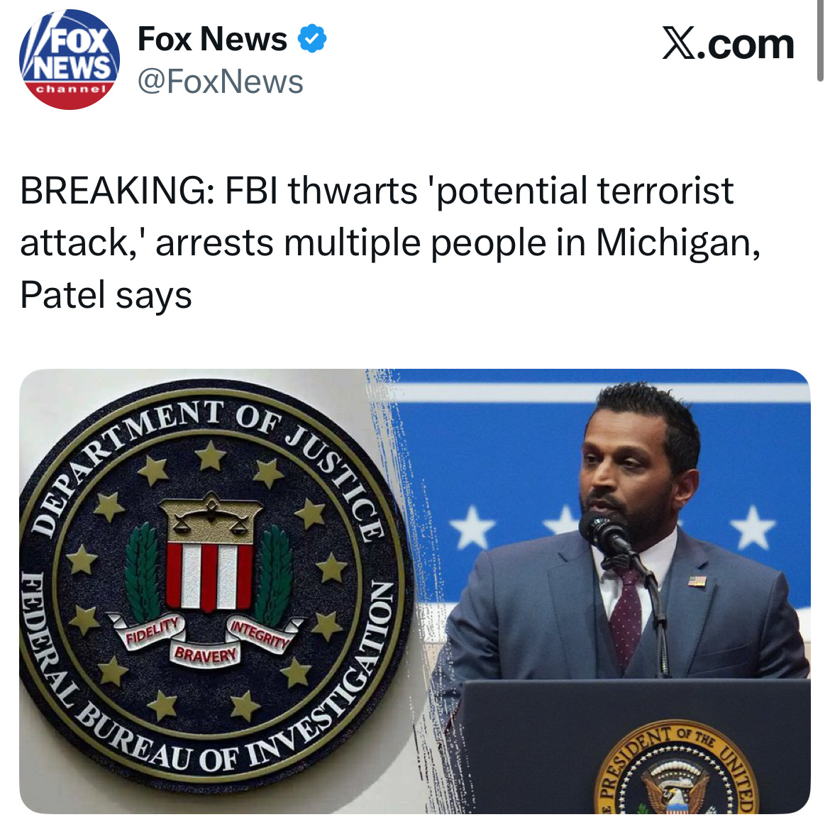 The FBI haven’t released details as yet: As per Kash Patel, “This morning the FBI thwarted a potential terrorist attack and arrested multiple subjects in Michigan who were allegedly plotting a violent attack over Halloween weekend. More details to come. Thanks to the men and women of FBI and law enforcement everywhere standing guard 24/7 and crushing our mission to defend the homeland.”